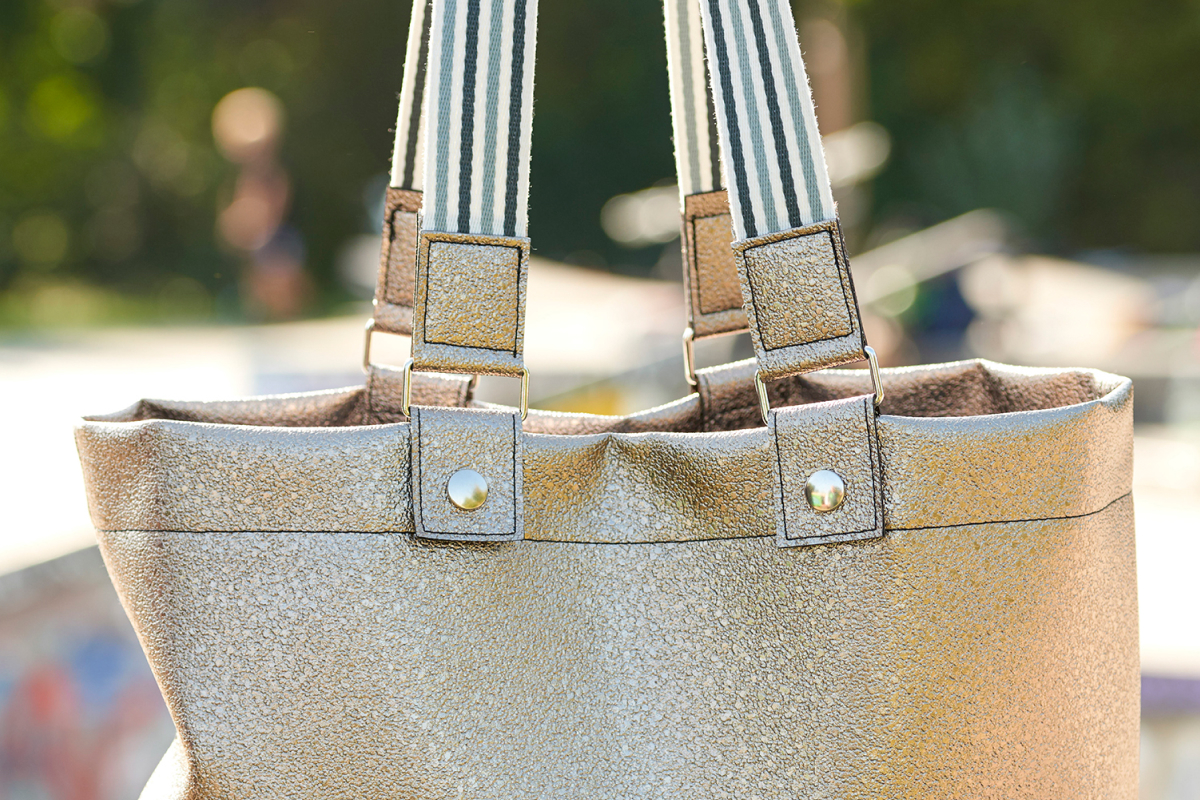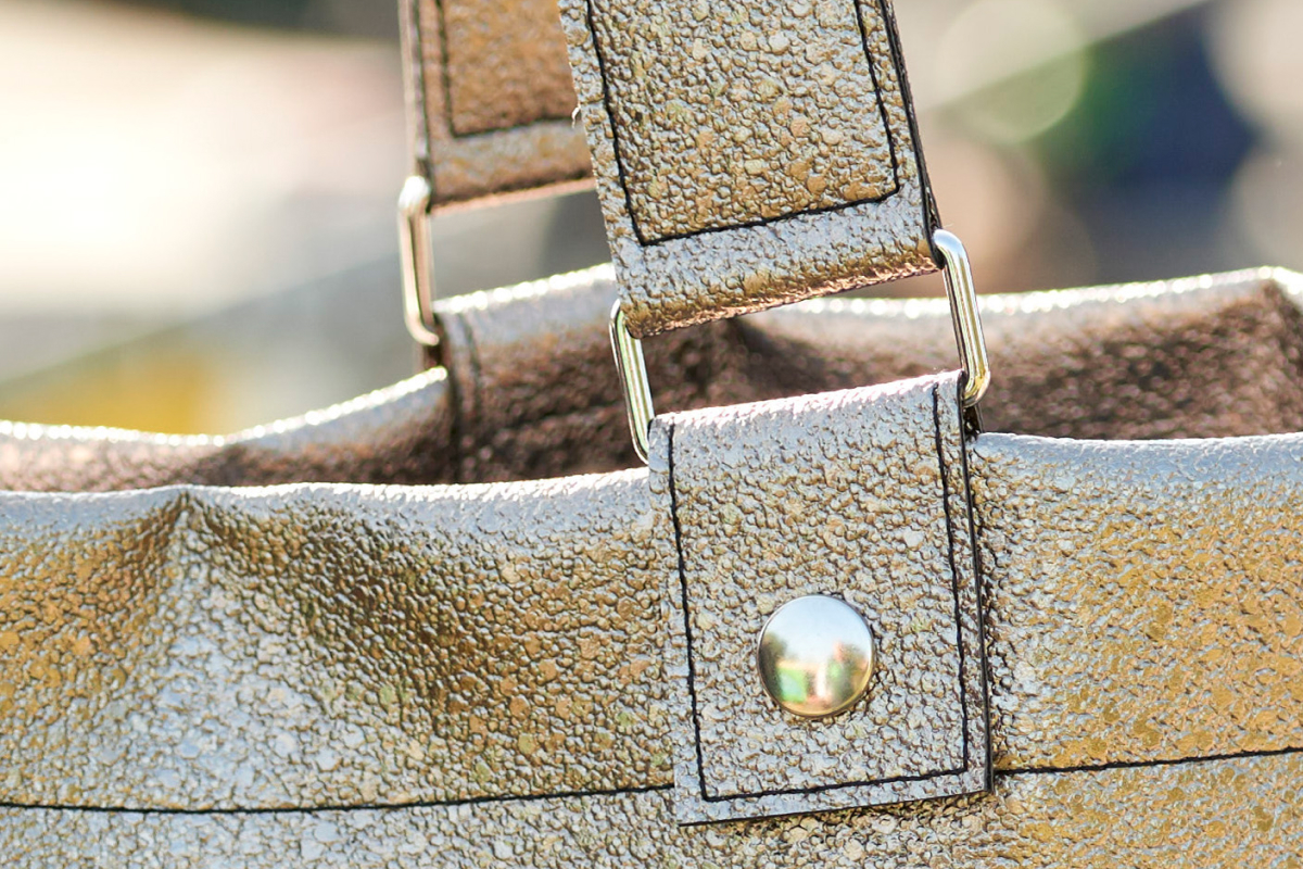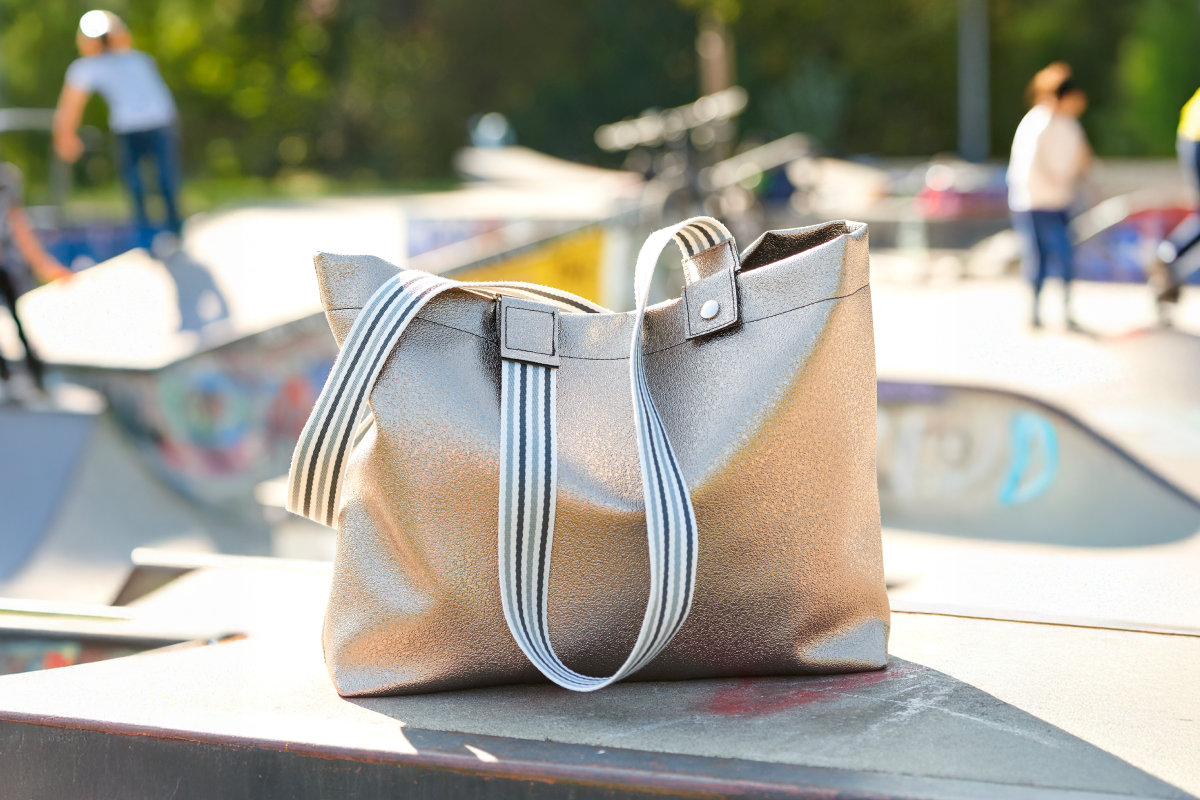 Этот спортивный шоппер непременно станет вашим новым фаворитом! Необычная металлическая ткань серебристого цвета имитирует поверхность грубых камней, а сам шоппер достаточно большой, чтобы вместить много вещей!